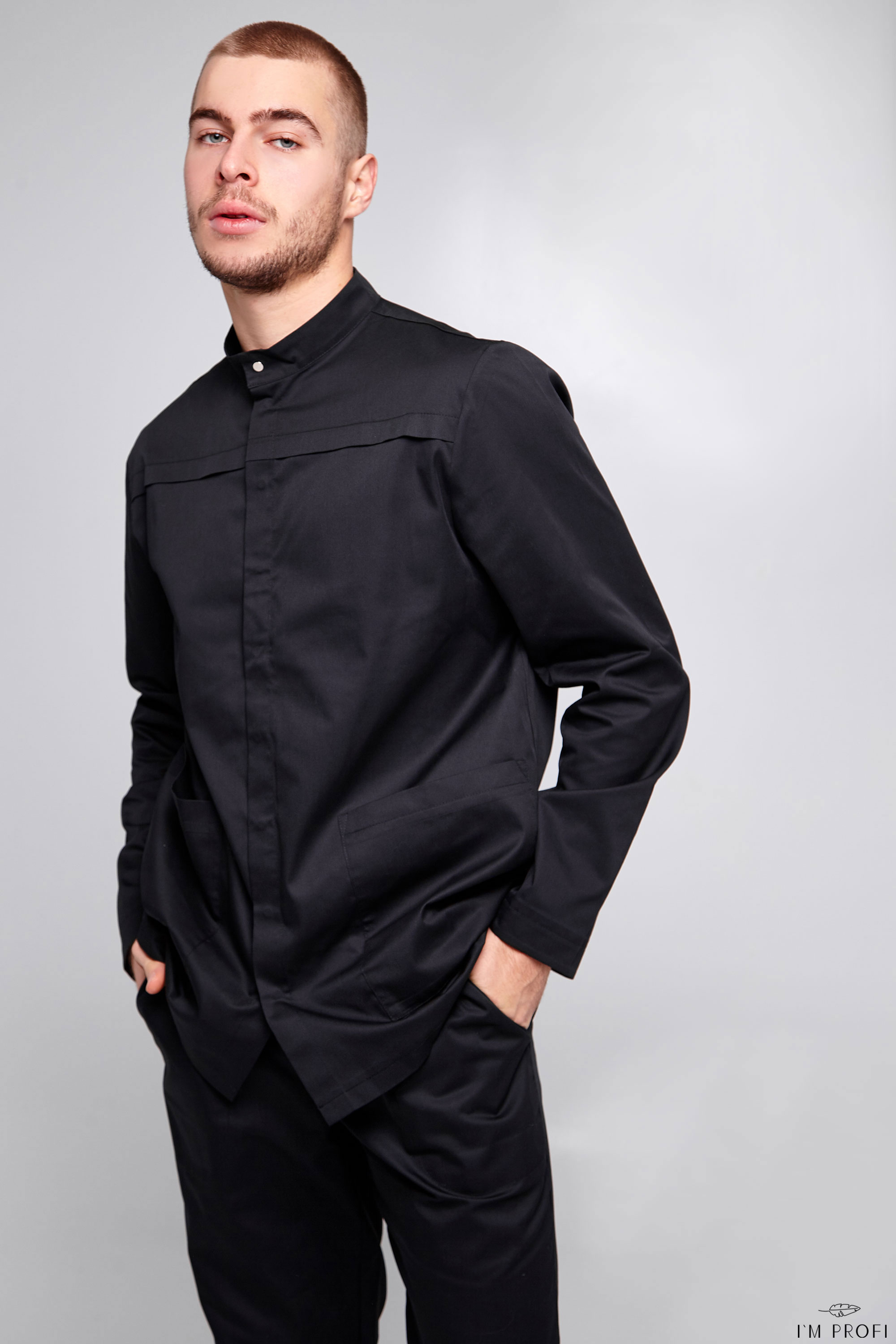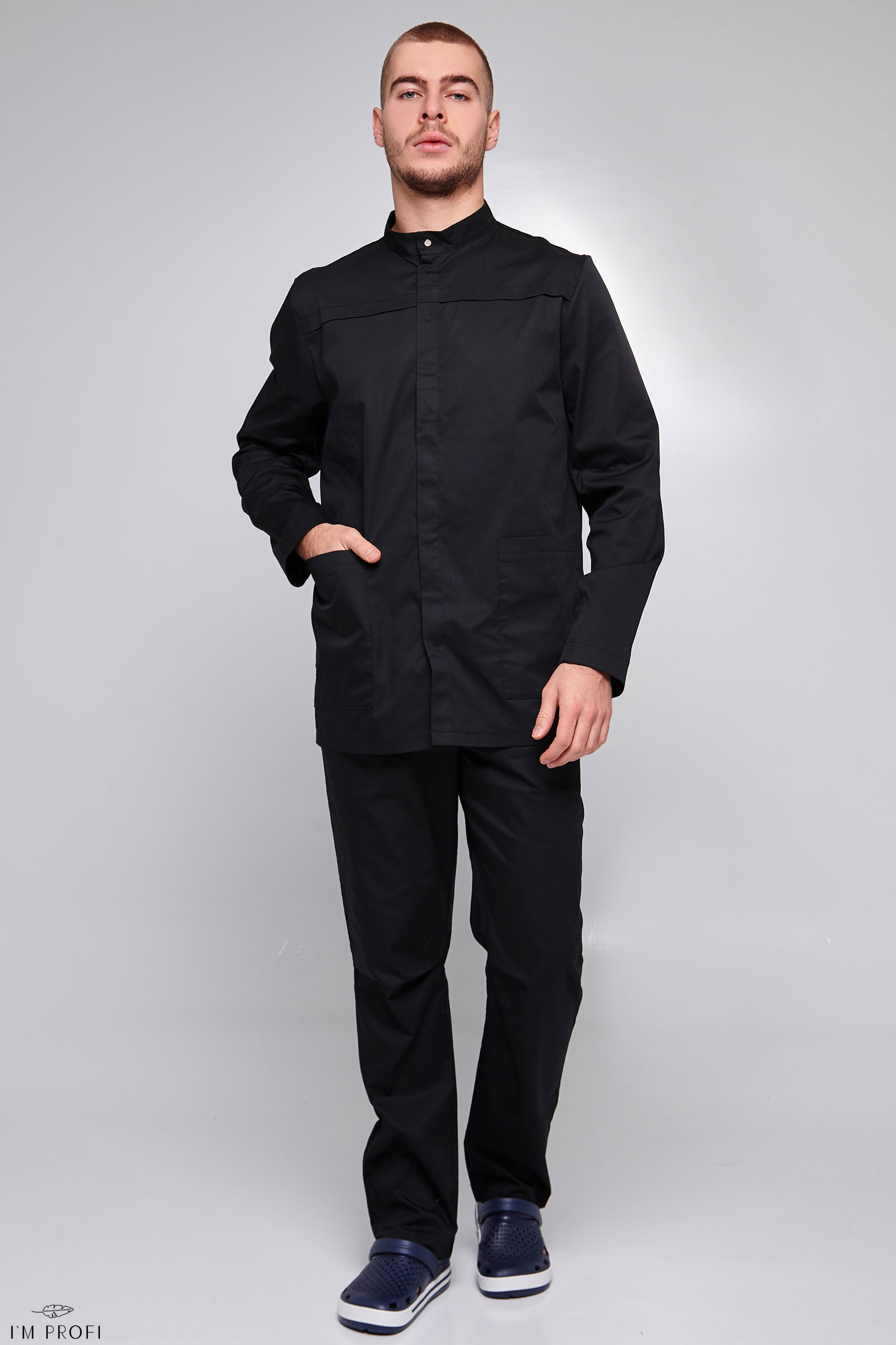 Чоловічий медичний костюм складається із жакету з довгим рукавом та комфортних прямих штанів. Жакет з оригінальними деталями, подовжений, з коміром-стійкою. Застібається на кнопки. Доповнений зручними місткими кишенями. Штани також оснащені кишенями.