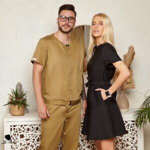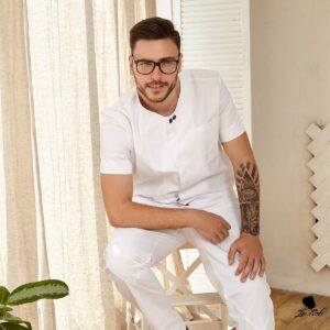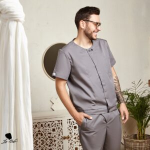 Оригінальний медичний костюм для чоловіків поєднує в собі практичність і стильний вигляд. Жакет із коротким рукавом, застібається на контрастні кнопки. Доповнений функціональною нагрудною кишенею. Штани із асиметричним гульфиком та декоративною облямівкою дуже незвичайні на вигляд, і в той же час зручні завдяки вільному крою. Пара бокових кишень додає практичності.