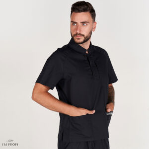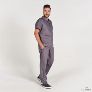 Чоловічий медичний костюм з капсульної колекції Profi by Profi. Виконаний з італійської бавовни, зносостійкий і приємний до тіла. Куртка з коміром-стійкою і невеликою застібкою на кнопки, прямого крою. Доповнена 4 місткими кишенями. Вільні штани ідеально сідають на будь-яку фігуру і комфортні за рахунок еластичного пояса зі шнуром. Пара кишень на брюках і один задній додають функціональності моделі.