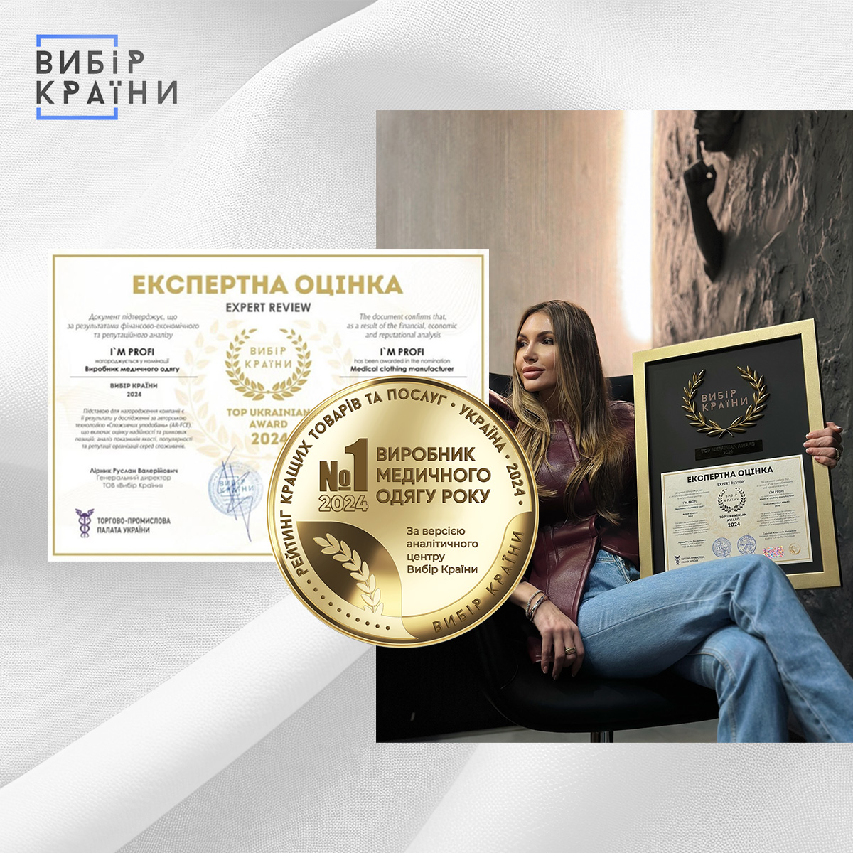 В грудні 2024 році ми стали переможцем премії «Вибір країни», здобувши нагороду як кращій «Виробник медичного одягу Україні в 2024 році» за результатами споживчих уподобань: клієнтоорієнтованості, відгуках і популярності серед покупців, репутацією, асортименту, цінової політики, характеристикам товарів, якості онлайн-ресурсів.