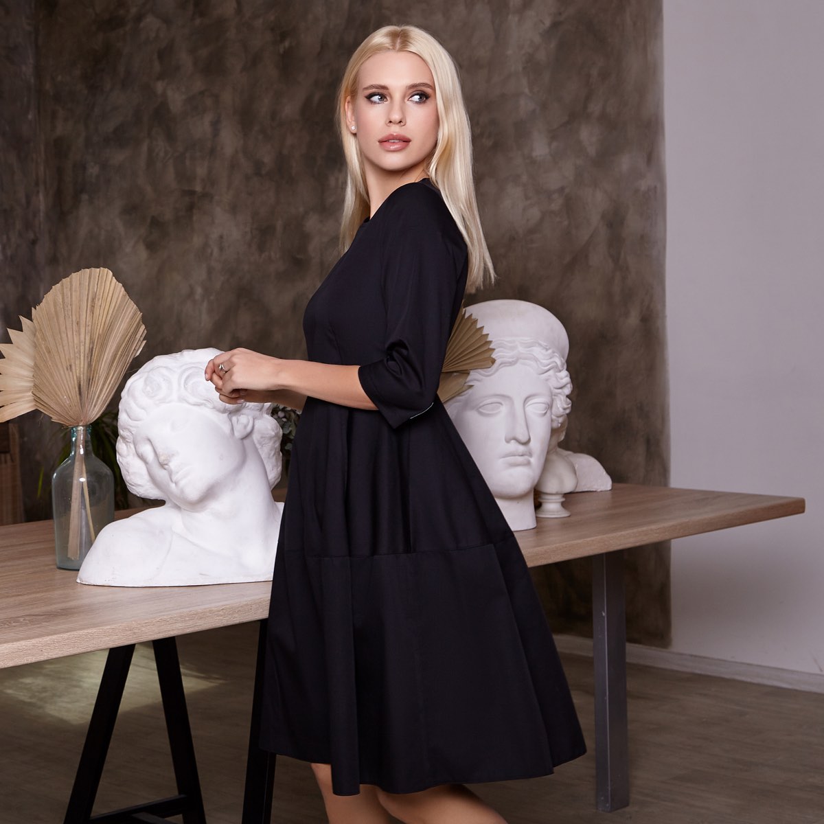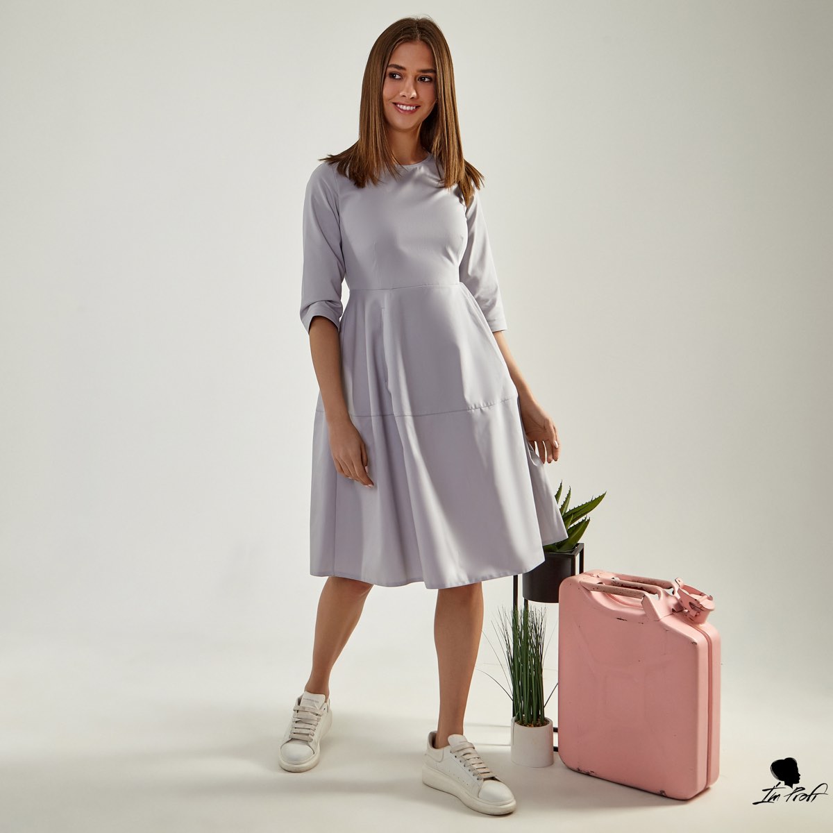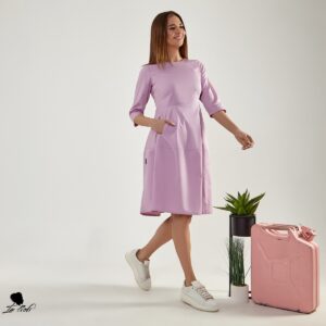 Медічна сукня жіночного крою з вкороченими рукавами. Завищена лінія талії і спідниця-кльош забезпечують комфорт і гарний вигляд на будь-якій фігурі, роблячи власника вищим і стрункішим. Сукня доповнена непомітними кишенями і застібкою-блискавкою на спинці.