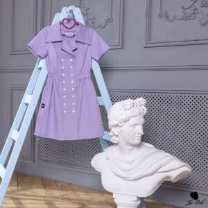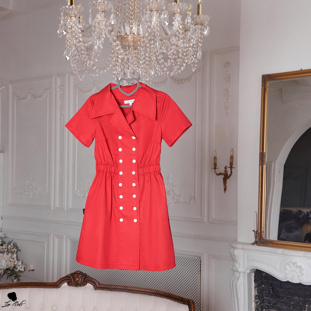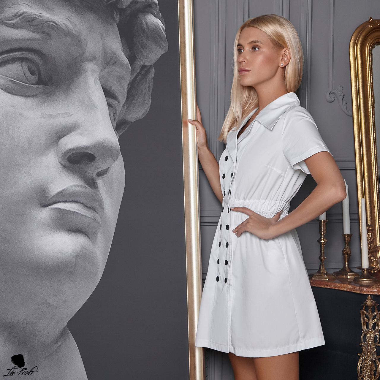 Жіночий медичний халат з коротким рукавом виглядає оригінально завдяки подвійному ряду кнопок. Еластична талія забезпечує комфортну посадку на будь-якій фігурі, а бокові кишені додають функціональності халату.