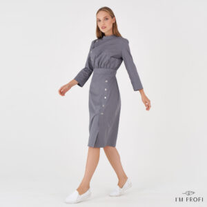 Жіночне медичне плаття з коміром-стійкою додасть елегантності в робочі будні. Зручна довжина міді та рукава 3/4 для більшого комфорту. Сукня облягаючого крою, добре підкреслює фігуру. Завищена талія і розріз на кнопках роблять фігуру візуально стрункішою і візуально вище. Ідеально сідає за рахунок еластичної талії. Плаття застібається на потаємну блискавку ззаду. Доповнено підкладкою, тримає форму і не просвічується.