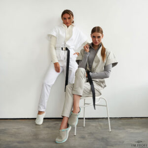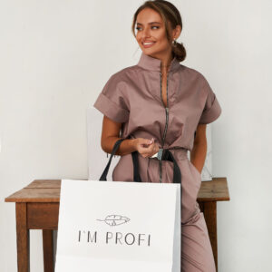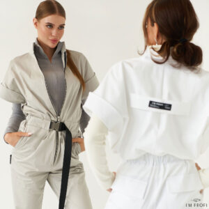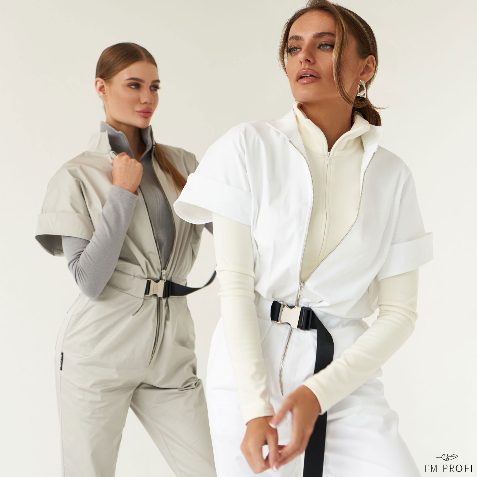 Комбінезон – незвичайне і стильне рішення уніформи для б’юті-майстра. Виріб напівприлеглого крою вигідно подає фігуру. Гумка на талії покращує посадку. Верхня частина моделі виконана зі складкою ззаду і оригинальними рукавами. Комбінезон застібається на металеву молнію YKK.Також фурнітура зі сріблом використовується на поясі. Накладні кишені на сзаду, а також прорізні кишені з боків додають функціональності.