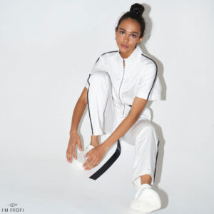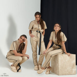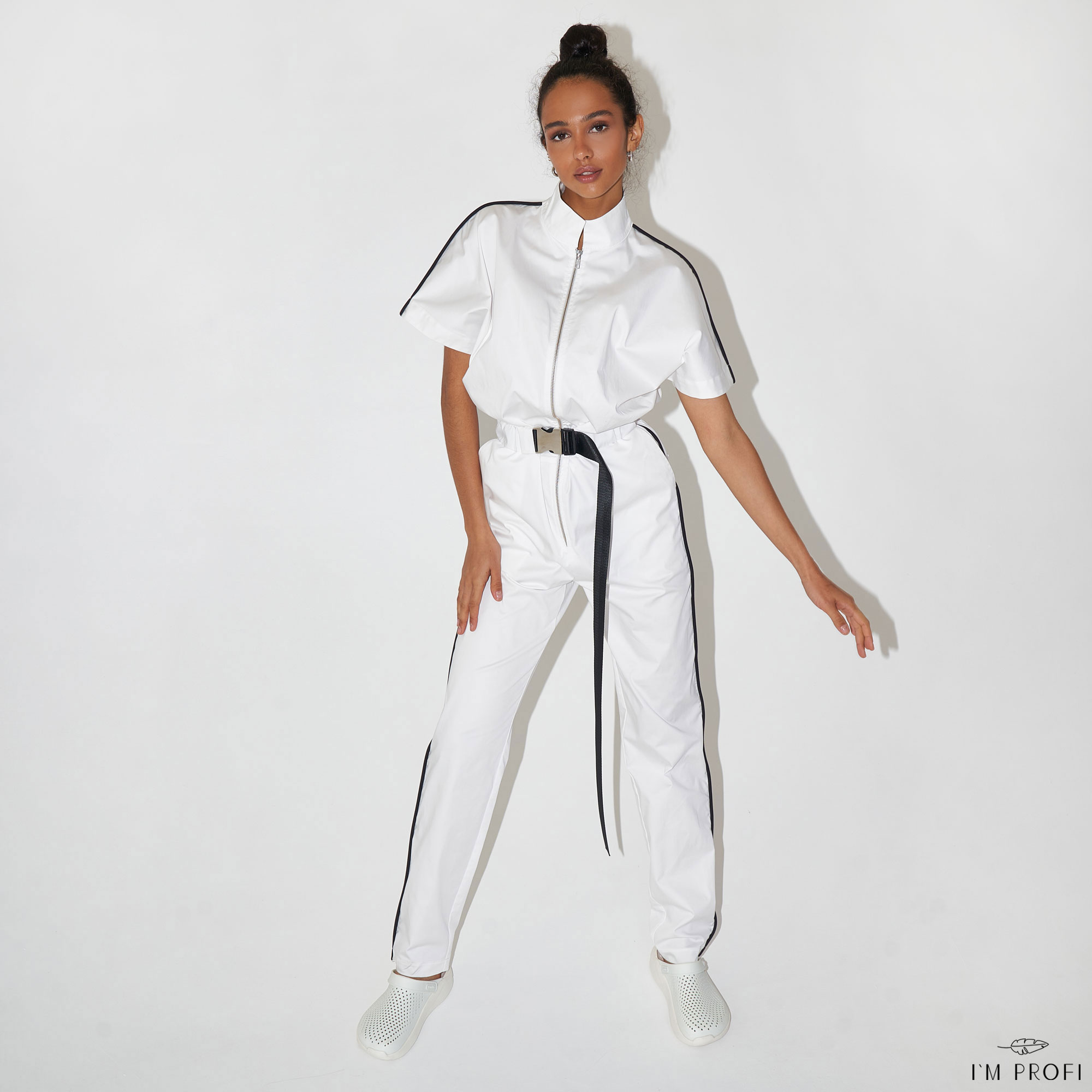 Комбінезон – незвичайне і стильне рішення уніформи для б’юті-майстра. Виріб напівприлеглого крою вигідно подає фігуру. Гумка на талії покращує посадку. Верхня частина моделі виконана зі складкою ззаду і оригинальними рукавами. Комбінезон застібається на металеву молнію YKK.Також фурнітура зі сріблом використовується на поясі.Накладні кишені на сзаду, а також прорізні кишені з боків додають функціональності.