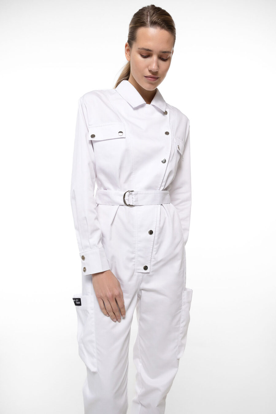 Стильний комбінезон для косметолога або бюті майстра, створений для тих, хто цінує сучасний дизайн та функціональність. Модель виконана в мінімалістичному стилі з асиметричною застібкою на кнопках, що додає оригінальності. Комір-стійка підкреслює строгий і водночас елегантний образ. Накладні кишені на грудях та стегнах забезпечують практичність і дозволяють зручно розмістити необхідні дрібниці. Ремінь із пряжкою акцентує талію, створюючи жіночний силует. Ідеальний вибір для професіоналів, які прагнуть виглядати стильно навіть під час роботи.