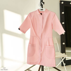 Приталений халат в спортивному стилі, ефектний та зручний. Довжина міні та вертикальні виточки виграшно підкреслюють фігуру. Рукав укорочений, комір-стійка. Халат застібається на приховані кнопки і має місткі накладні кишені.
