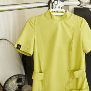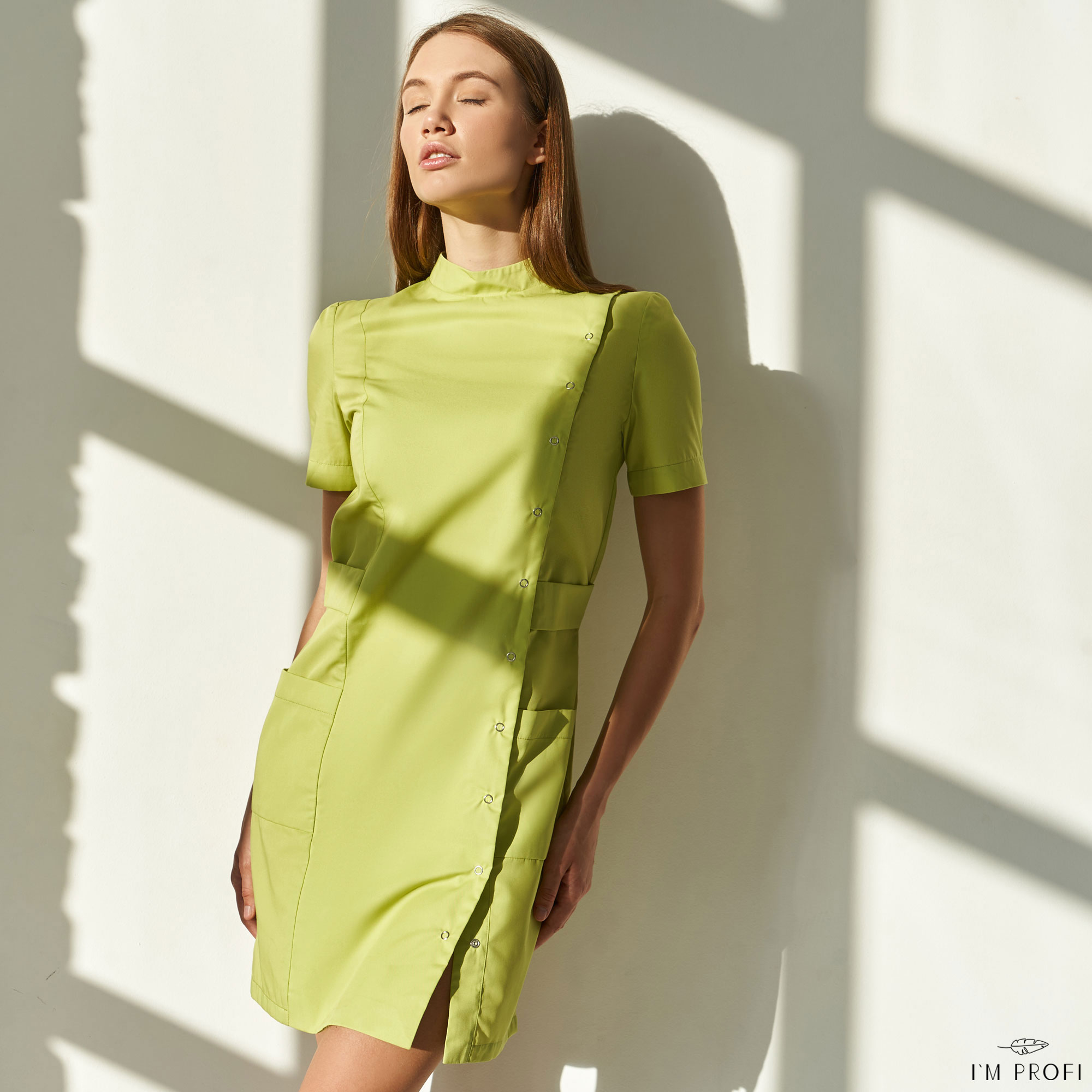 Оригінальний медичний халат з нової колекції "Подих кольору" підкреслить вашу неординарність. Приталений халат довжини міні, з короткими рукавами і функціональними кишенями. Виглядає незвично за рахунок асиметричною застібки на кнопки. Лінія кнопок і вертикальні виточки витягують силует. Комір-стійка з застібкою на плечі – стильне рішення для уніформи.