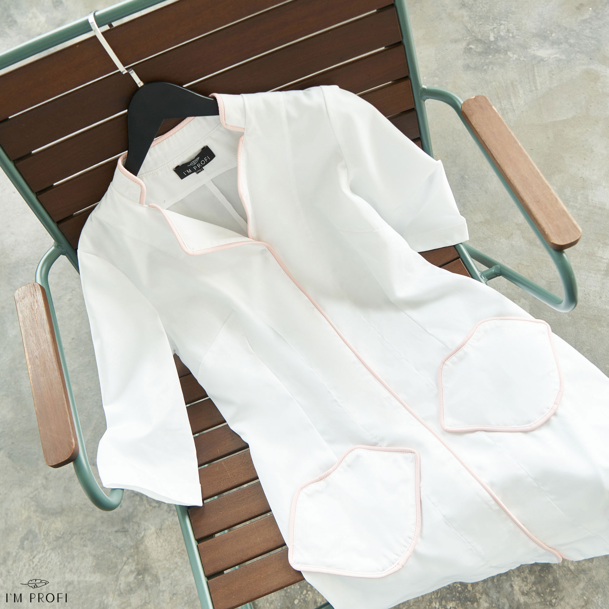 Елегантний жіночий медичний халат з коміром-стійкою – практичне і стильне рішення. Халат зручної довжини міді з боковими розрізами і прихованою застібкою на кнопки м’яко облягає фігуру. Увага до деталей: Халат доповнений двома стильними функціональними кишенями у формі губ з контрастним кантом.