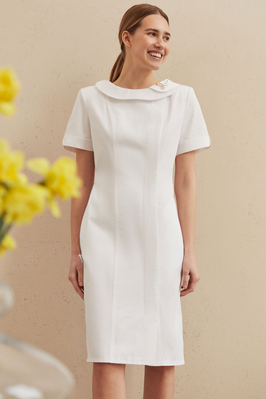 Жіночний медичний халат із круглим комірцем - найкращий вибір для професіоналів у сфері медицини та косметології. Його зручна довжина та напівприлеглий крій ідеально облягають будь-яку фігуру. Застібка на потаємні ґудзики, елегантна брошка та пояс ззаду зі шлицею стильно підкреслюють вишуканість і професійність.