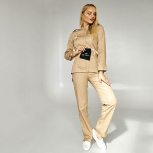 Медичний костюм для лікаря або бьюті-майстра складається з приталеної куртки та комфортних прямих штанів. Куртка лаконічного крою доповнена оригінальними та функціональними деталями. В поясі ззаду — еластична вставка для покращення посадки по фігурі. Спинка трохи подовжена. Застібка на приховану блискавку. Хлястики з кнопкою на рукавах дозволяють варіювати їх довжину.
