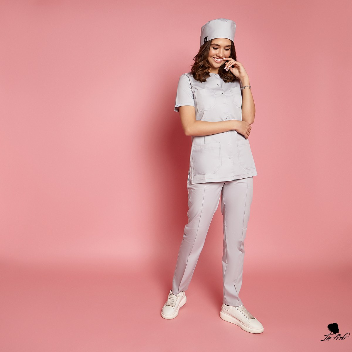 Костюм із коротким рукавом для лікаря складається із жакету та штанів зі стрілками. Жакет без коміру застібається на зручні кнопки. Має чотири місткі накладні кишені. В пару до жакета – прямі штани зі стрілками.