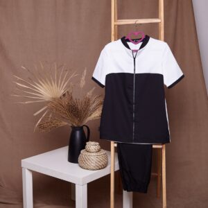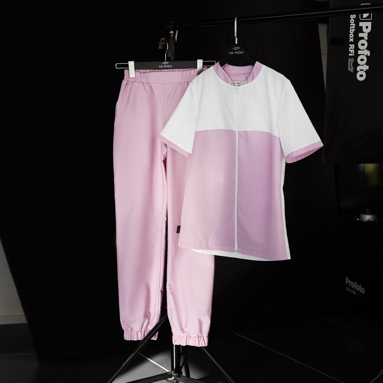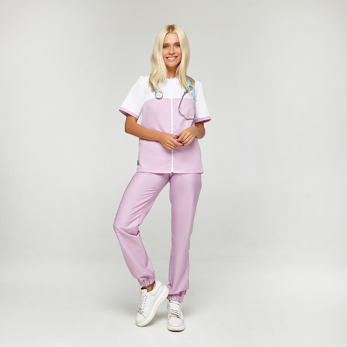 Цей медичний костюм поєднує в собі стиль і комфорт. Сорочка з коротким рукавом вільного крою зручно застібається на блискавку, оснащена місткими кишенями. Штани сідають по фігурі, знизу зібрані на резинку, що практично за активної діяльності.