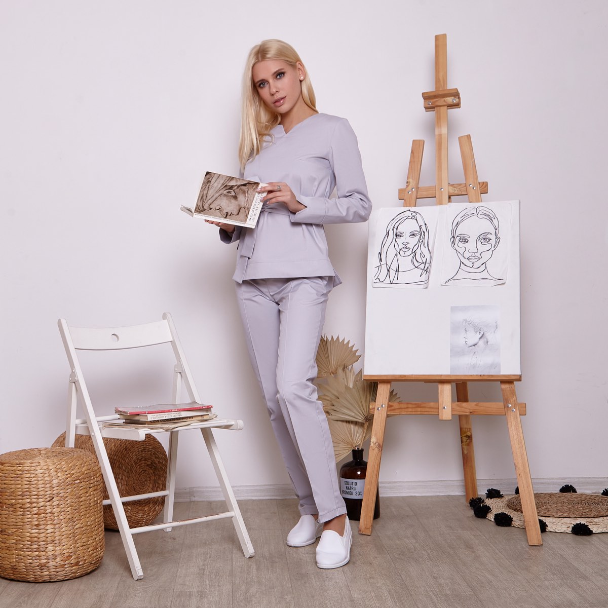 Жіночий медичний костюм з довгим рукавом лаконічного крою. Куртка зі знімним поясом, без зайвих деталей, цікава на вигляд завдяки розрізам на комірі, рукавах та по бокам виробу. Застібається на приховану блискавку ззаду. Штани зі стрілкою подовжують силует, скроєні по фігурі, доповнені функціональними кишенями.