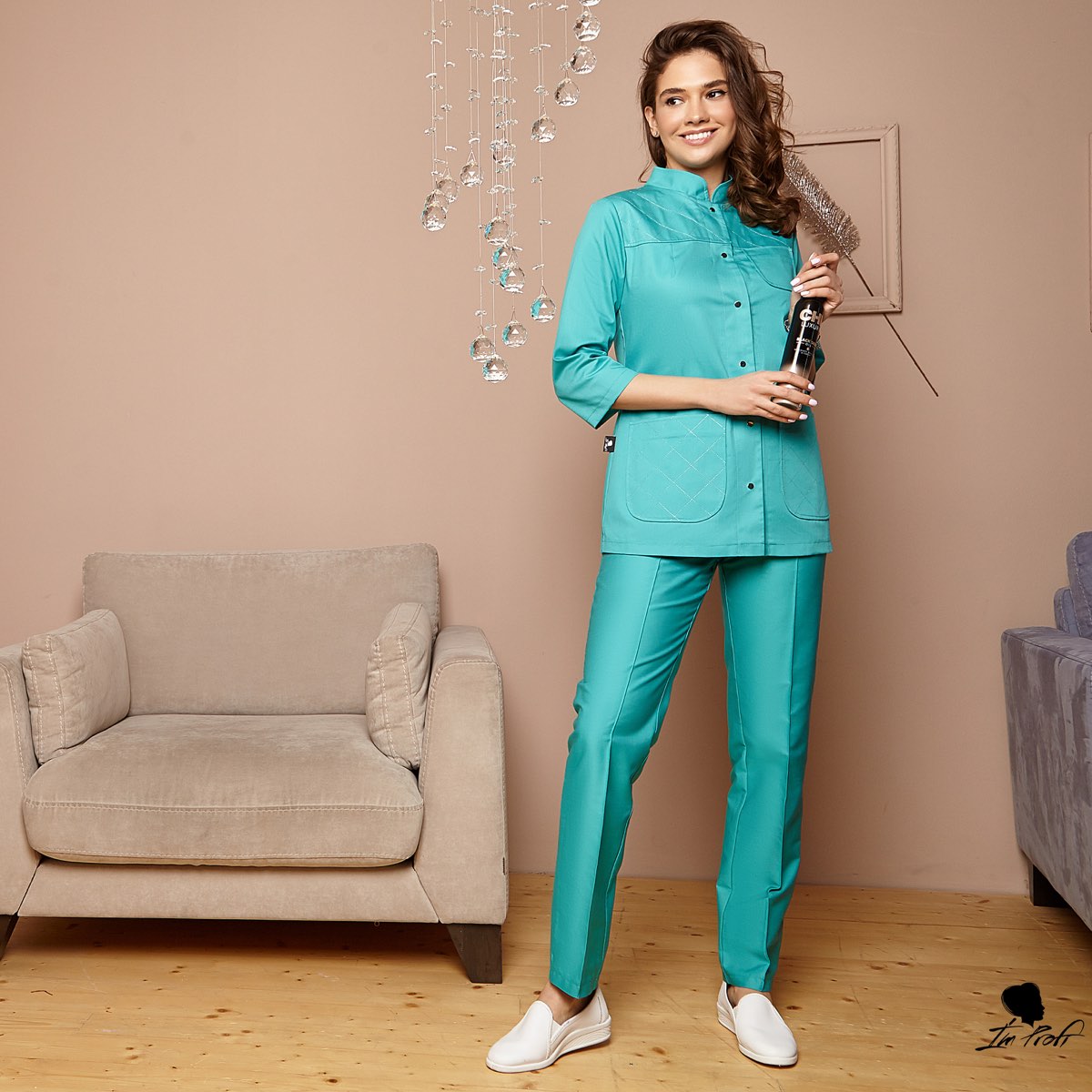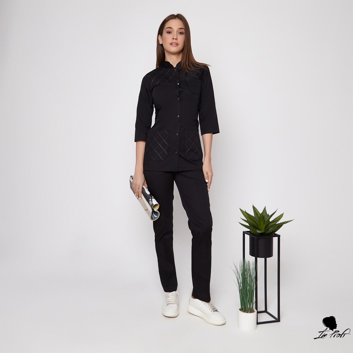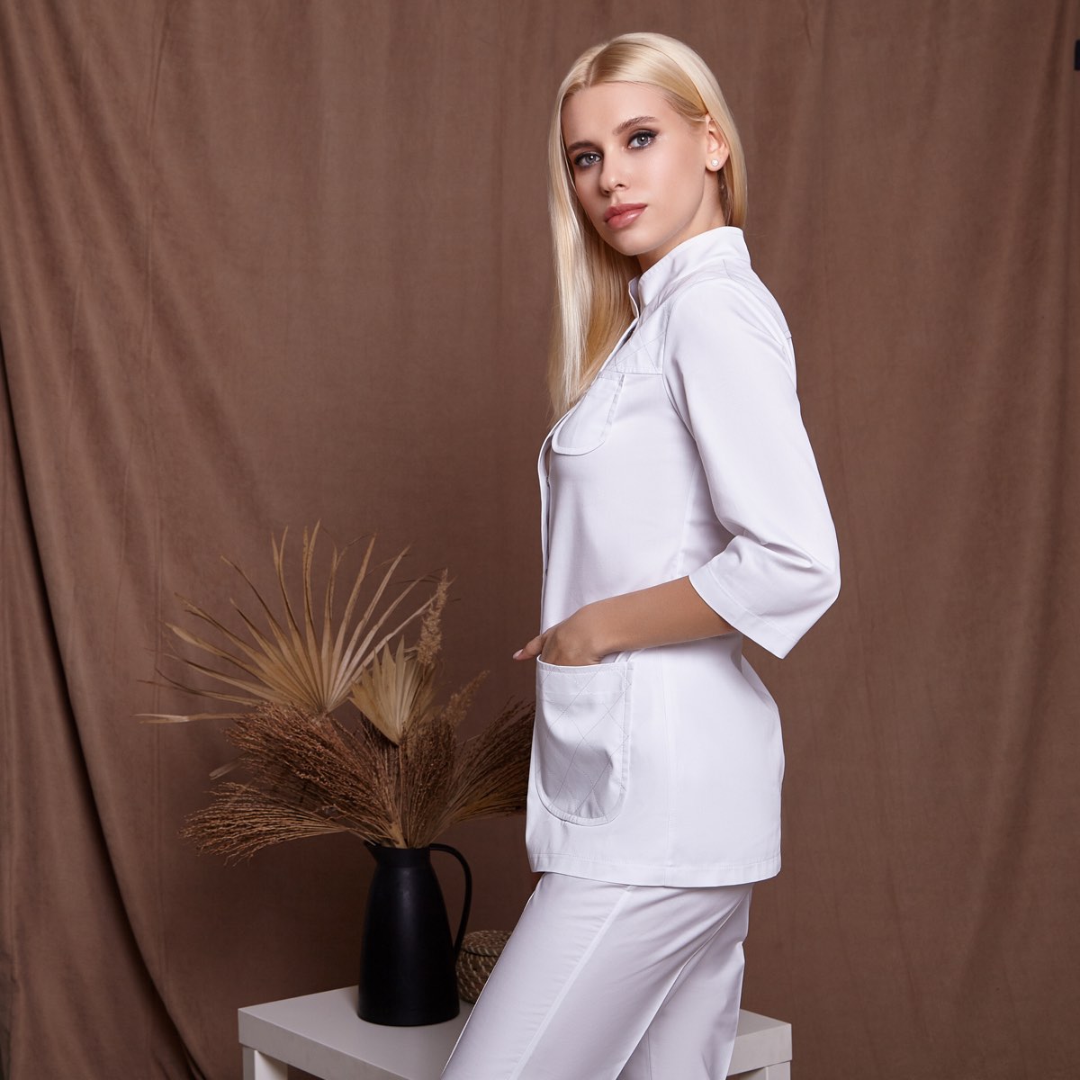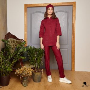 Елегантний приталений жакет та штани зі стрілкою складають цей красивий медичний костюм. Жакет з коміром-стійкою та вкороченими рукавами. Застібається на контрастні гудзики. Особливого шарму додає декоративний шов срібною ниткою вздовж застібки і на кишенях.