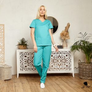 Цей хірургічний жіночий костюм поєднує в собі функціональність із привабливим зовнішнім виглядом. Лаконічний крій прямої сорочки із коротким рукавом і прямих штанів забезпечує зручність в носінні. Костюм доповнений великою кількістю кишень з оригінальними декоративними деталями: на сорочці 2 накладні кишені і нагрудна, в штанях окрім традиційних прорізних кишень є 2 накладні по боках.