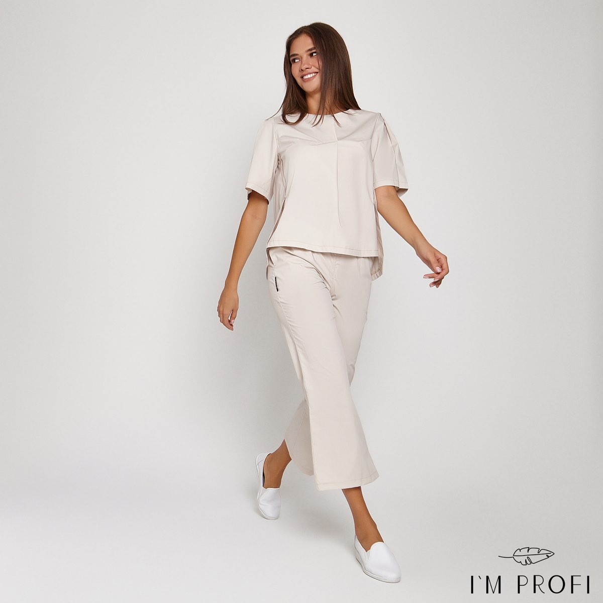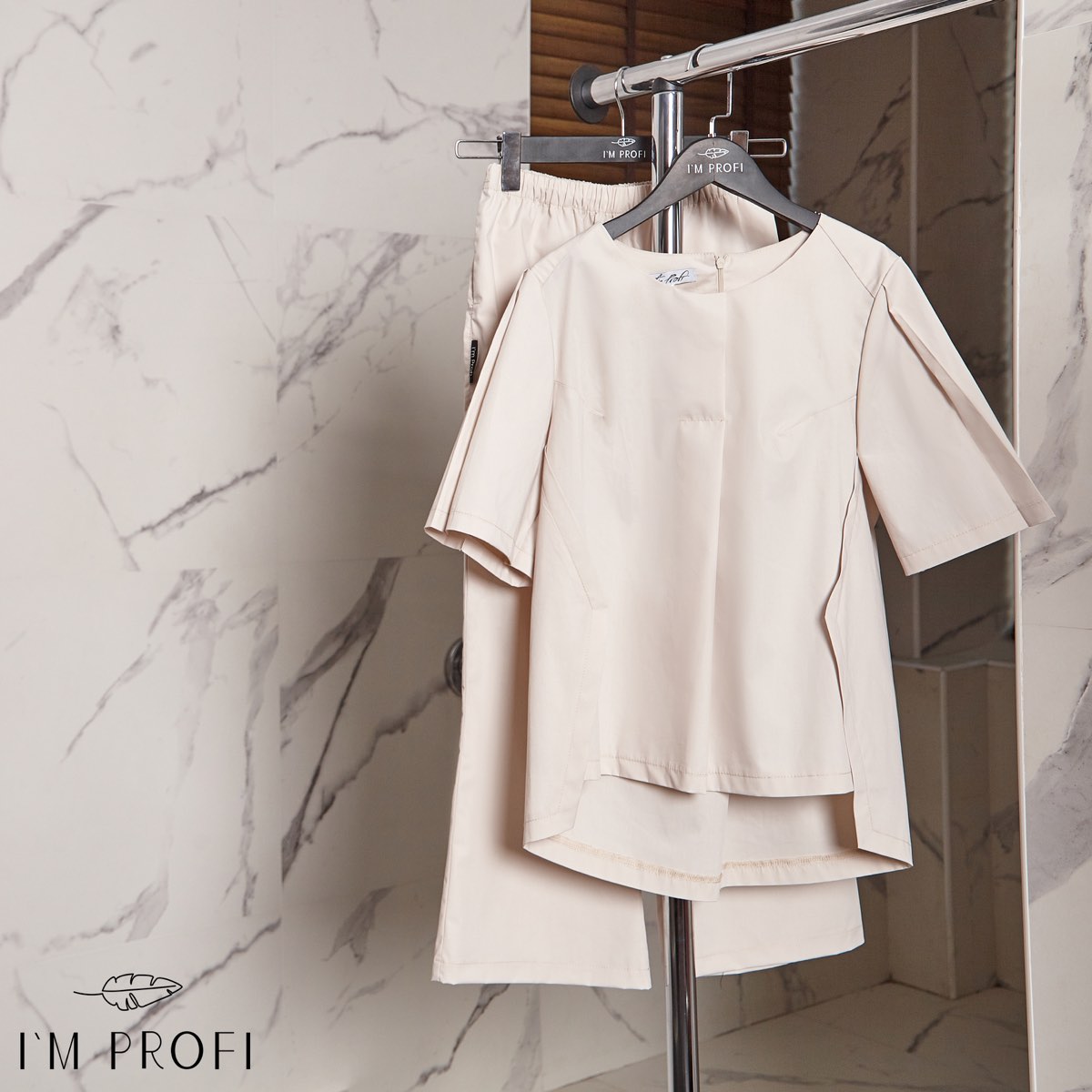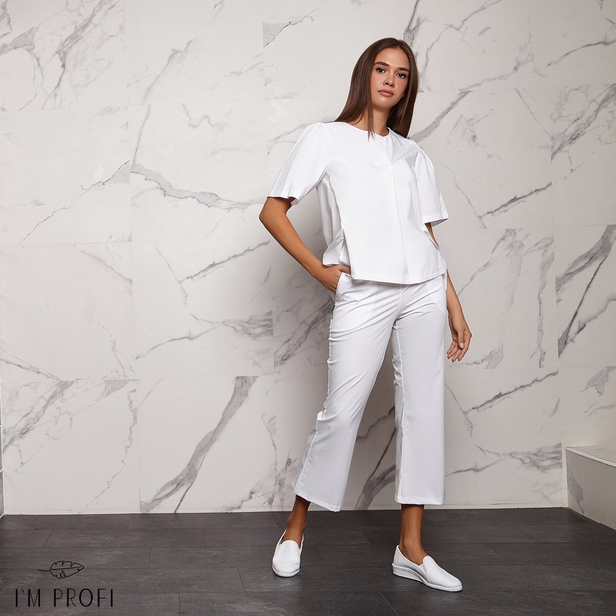 Медичний костюм для лікаря або б'юті-майстра складається з модних штанів-кюлотів. Сорочка із жіночними рукавами-ліхтариками і подовженою спинкою на сковує рухи. Комфортні вкорочені штани також мають вільну посадку і доповнені прорізними кишенями.