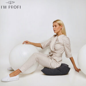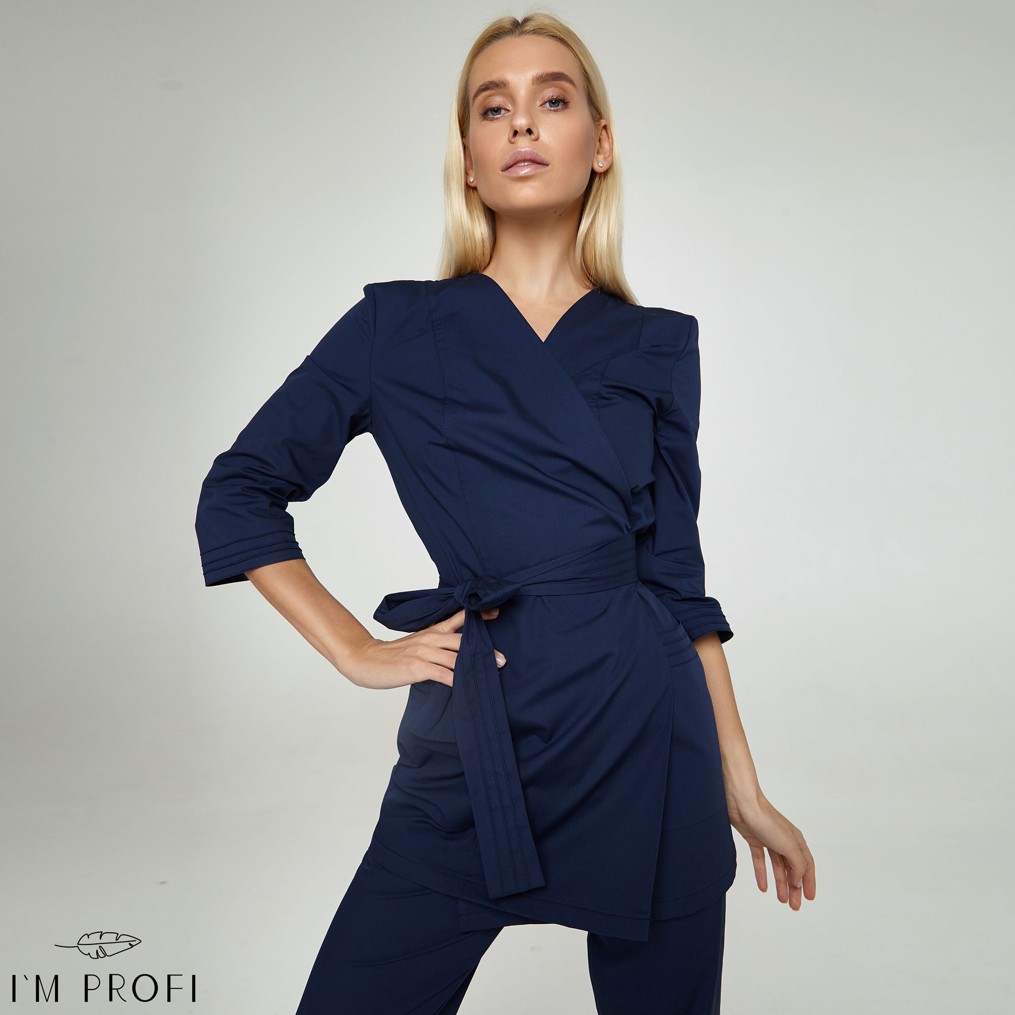 Жіночий медичний костюм з італійської тканини, вишуканий та функціональний. Жакет із рукавами ¾ скроєний на запах, тому подовжує силует. Доповнений широким поясом в тон і парою містких кишень. Штани прилягаючого крою також оснащені кишенями. Костюм дорогий на вигляд завдяки облямівці потрійною строчкою, та чудово сідає по фігурі завдяки якісній тканині зі стрейчем.
