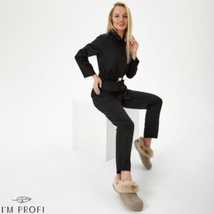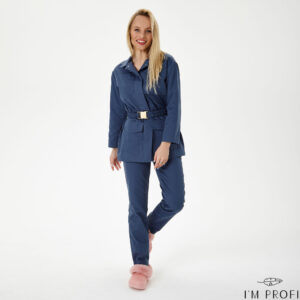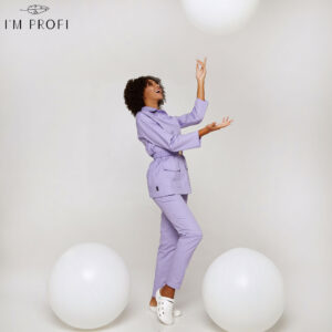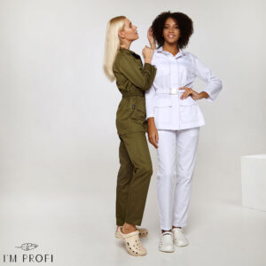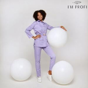 Стильний жіночий костюм для б'юті-майстра. Жакет в стилі мілітарі приталеного крою застібається на приховані кнопки. Доповнений місткими кишенями і еластичним поясом із гравірованою пряжкою. В парі з жакетом – лаконічні завужені штани з прорізними кишенями.