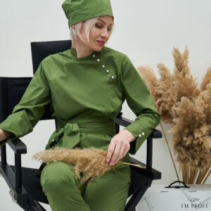 Жіночний костюм для б'юті-майстра або лікаря. Блуза з рукавом ¾ привертає увагу асиметричною застібкою на перлинні гудзики. Такі ж гудзики прикрашають рукава. При бажанні блузу можна приталити широким поясом в тон. Штани завужені, з гульфіком на кнопці. Ззаду доповнені гумкою в поясі для кращої посадки по фігурі. У комплекті медична шапочка з декоративними намистинами з колекції "В ритмі пульсу".