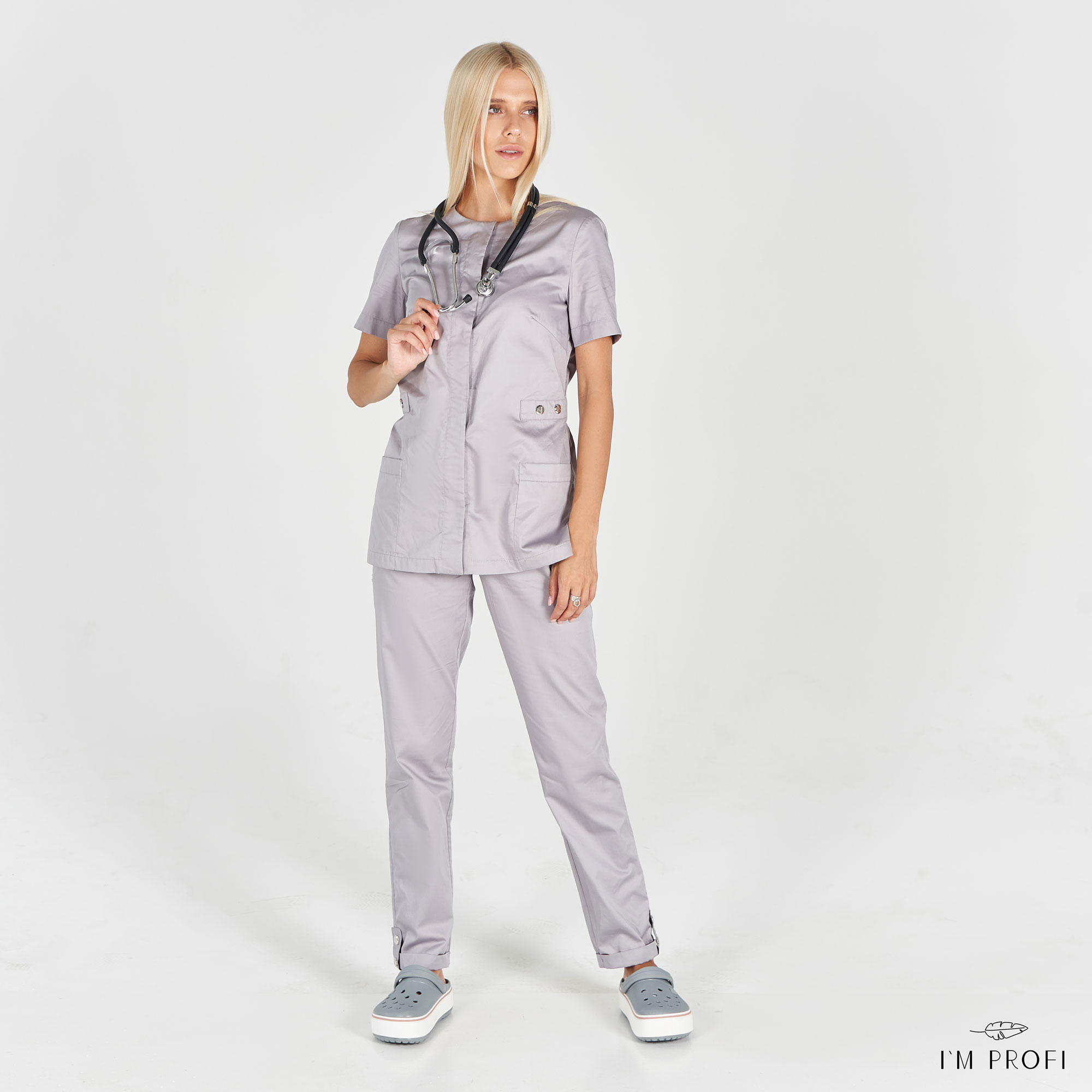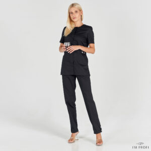 Костюм жіночий для медика або б'юті-майстра зі 100% бавовни. Складається з блузи з коротким рукавом і зручних штанів по фігурі. Приталена блуза застібається на потаємні кнопки і доповнена місткими кишенями. Штани комфортного прилягання, з кишенями, на поясі фіксуються гумкою і шнуром. Лаконічний костюм доповнений ефектним декором з металевих кнопок на поясі блузи і по низу брюк.