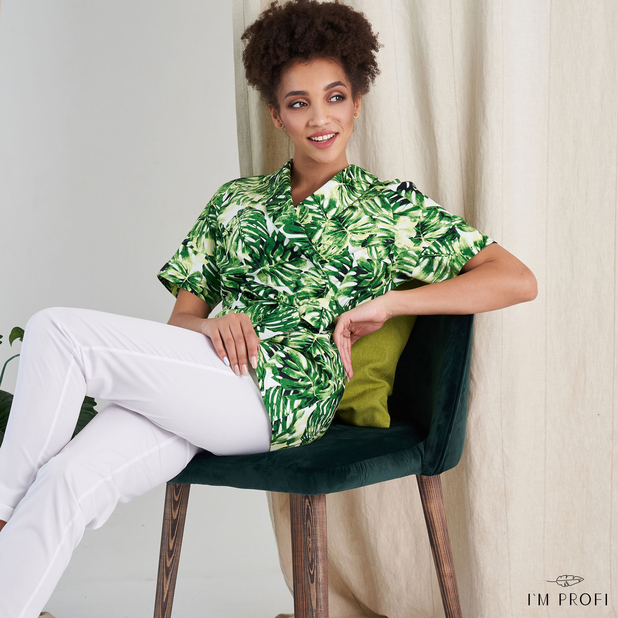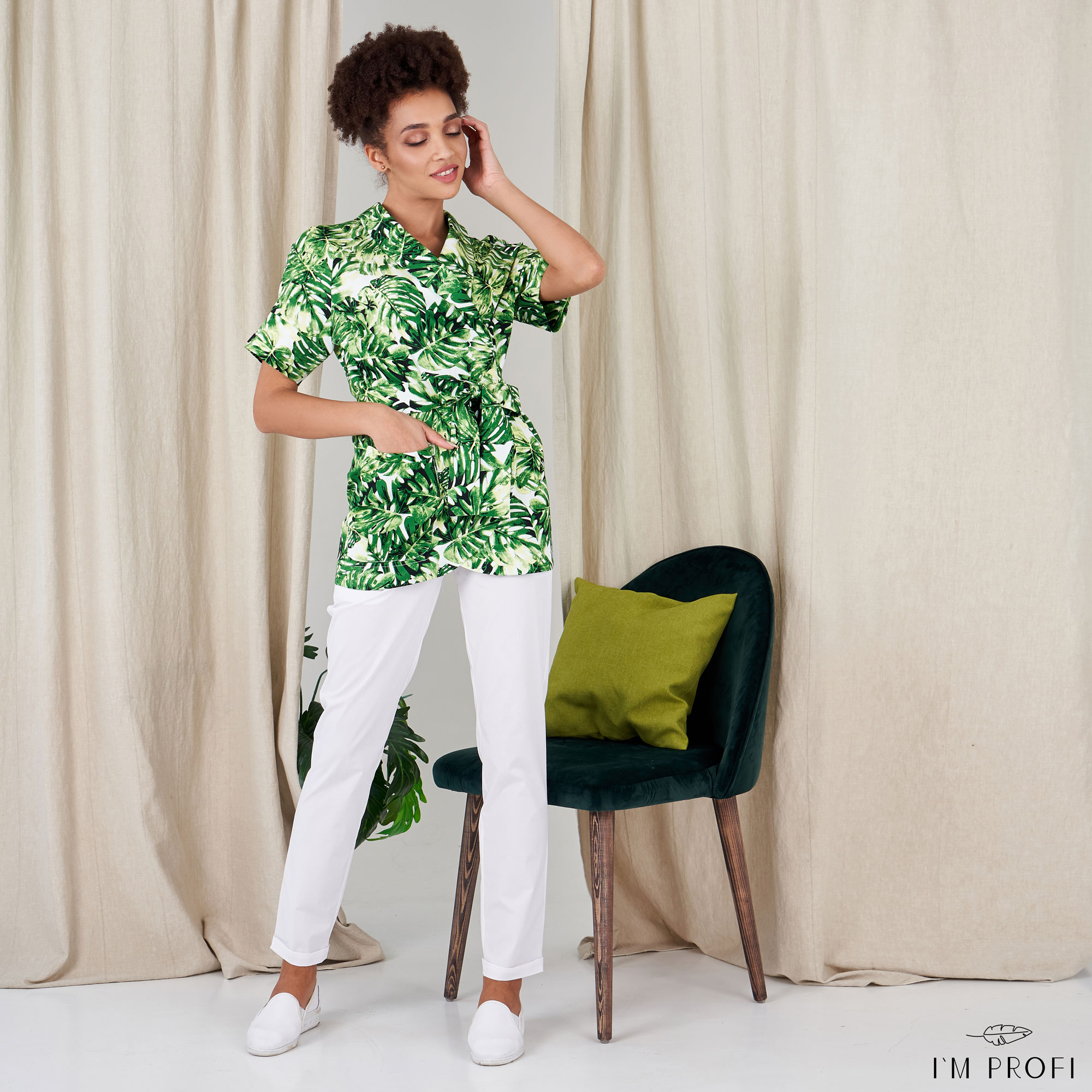 Костюм медичний для б’юті-майстра або лікаря з коротким рукавом. Жакет на запах підходить до будь-якої фігури, доповнений широким поясом і лаконічною кишенею. Комфортні штани прямого крою з кишенями виконані із закотом знизу.