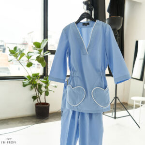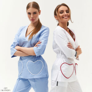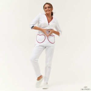 Жіночий костюм для б’юті майстра виконаний з медичного котону. Оригінальна куртка з рукавом 3/4, та резинкою по талії. Доповнена тематичними декором і парою лаконічних кишень. Штани комфортно облягають фігуру, і також мають пару кишень.