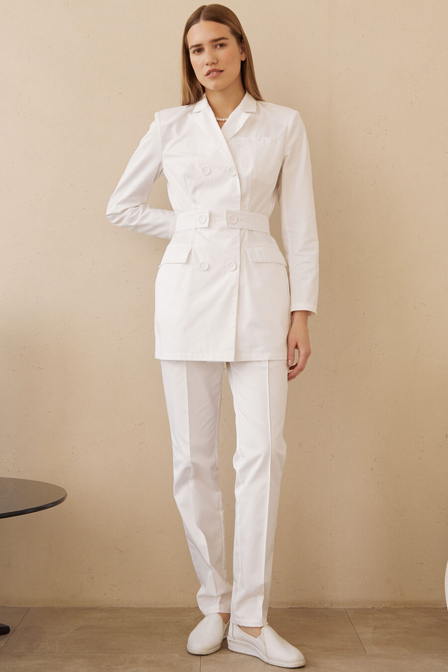 Елегантний двобортний медичний жакет у стилі піджака з вишуканими ґудзиками, які гармонійно поєднуються з дизайном. У комплекті пропонуємо комфортні медичні штани зручного крою зі стрілкою, що додають вашому образу додаткової ноти стилю. Ці предмети одягу ідеально доповнюють один одного, створюючи неповторний і стильний образ для професійної діяльності.