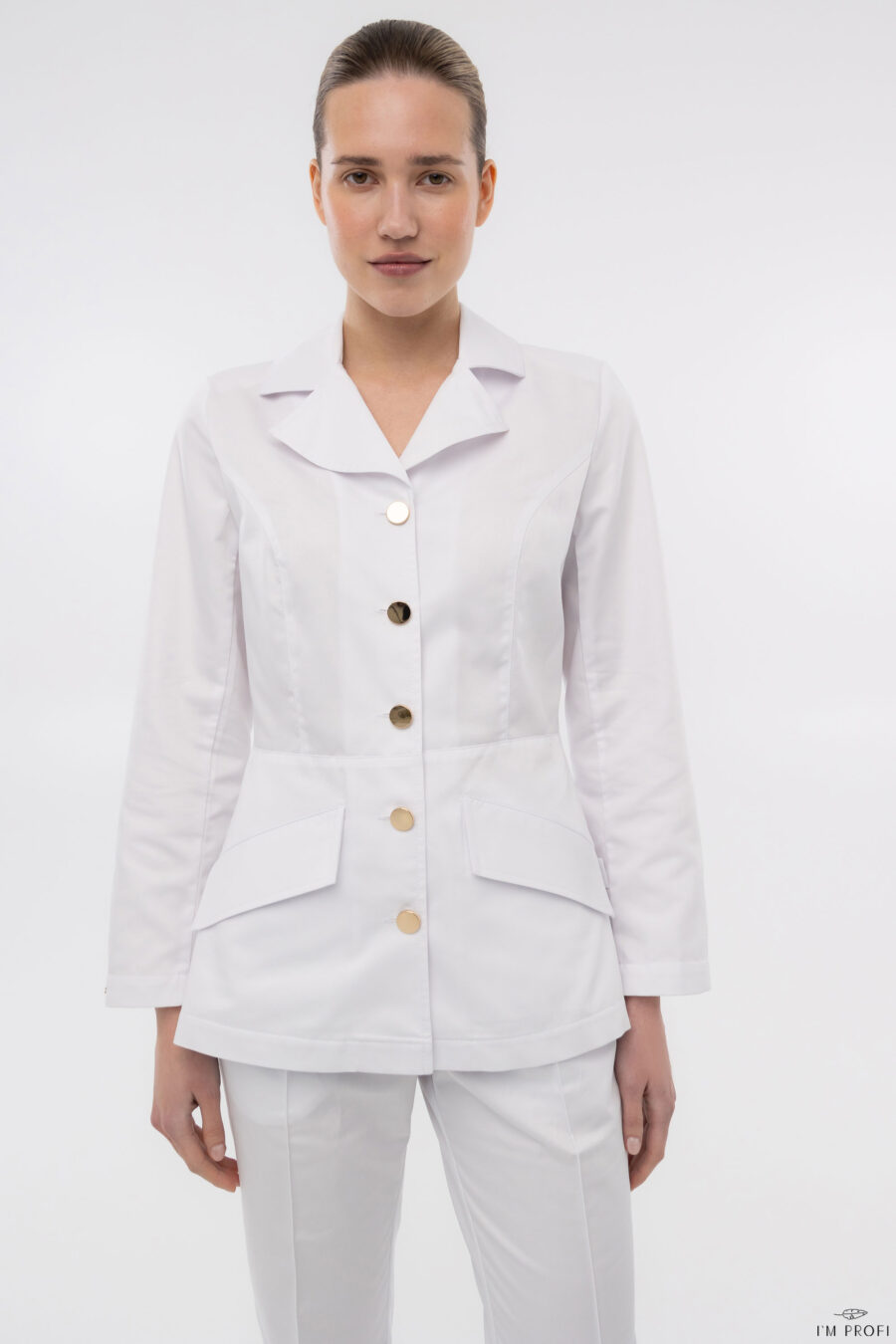 Елегантний жіночий медичний костюм ідеально підійде для лікарів, косметологів та інших фахівців сфери медицини й краси. Комплект складається з приталеного жакета з довгим рукавом і класичних штанів зі стрілками. Жакет вирізняється витонченим силуетом, елегантним коміром та застібкою на стильні золотисті ґудзики. Модель доповнена лаконічними та зручними кишенями для практичного використання. Штани зі стрілками візуально подовжують ноги та додають фігурі стрункості. Пояс на резинці зі шнурком забезпечує комфортну посадку та надійну фіксацію протягом усього дня. Бічні кишені підвищують функціональність і зручність у роботі. Цей жіночий медичний костюм — вдале поєднання професійного вигляду, зручності та сучасного стилю. Ідеальний вибір для тих, хто цінує комфорт і бездоганний зовнішній вигляд у щоденній медичній практиці.