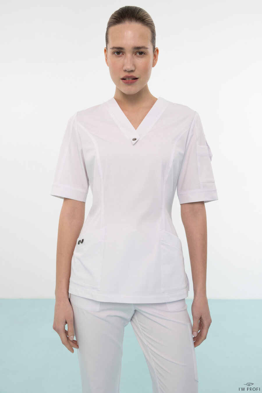 Блуза прямого крою з короткими рукавами доповнена елегантним V-подібним вирізом, прихованою блискавкою та зручними кишенями. Вона чудово сідає на будь-яку фігуру, підкреслюючи витонченість силуету. Штани з п’ятьма додатковими кишенями — ідеальні для активного робочого дня. Усі деталі продумані до дрібниць: легка тканина, дихаючий матеріал, комфорт у русі.