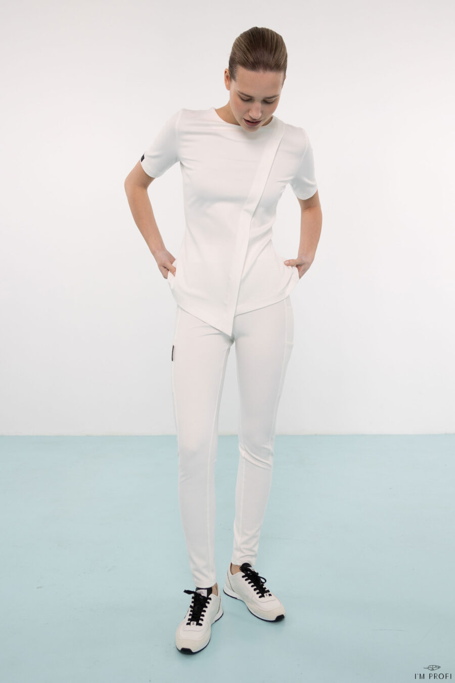 Виготовлений із легкої, дихаючої тканини — поєднання бавовни та еластану. Матеріал приємний до тіла, добре тягнеться та дозволяє вільно рухатися протягом усього дня. Медичний топ асиметричного крою з функціональною блискавкою спереду та потайною збоку забезпечує легке надягання. Короткі рукави та розріз на спині додають свободи рухів і підкреслюють сучасний дизайн. Медичні штани з високою посадкою на еластичному поясі ідеально прилягають до фігури. Чотири зручні бічні кишені роблять модель максимально практичною для щоденної роботи.